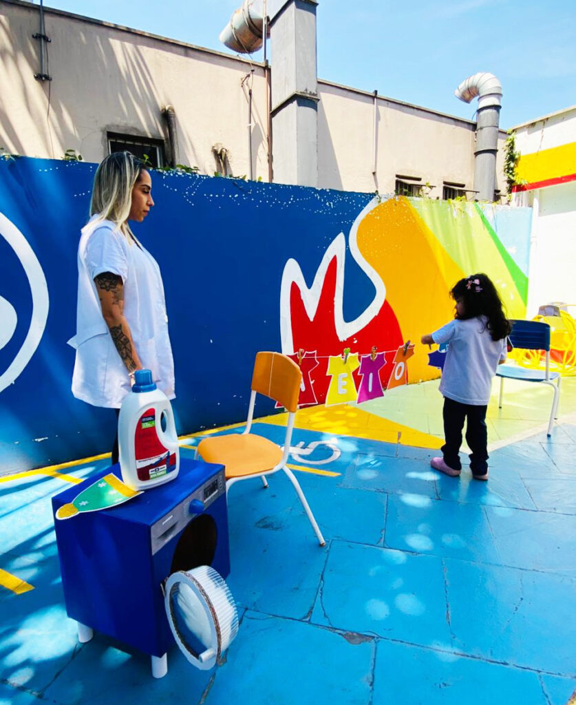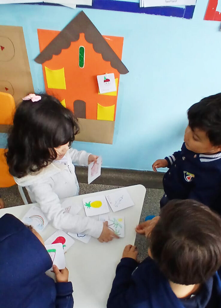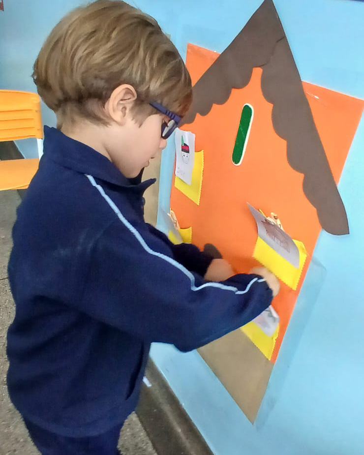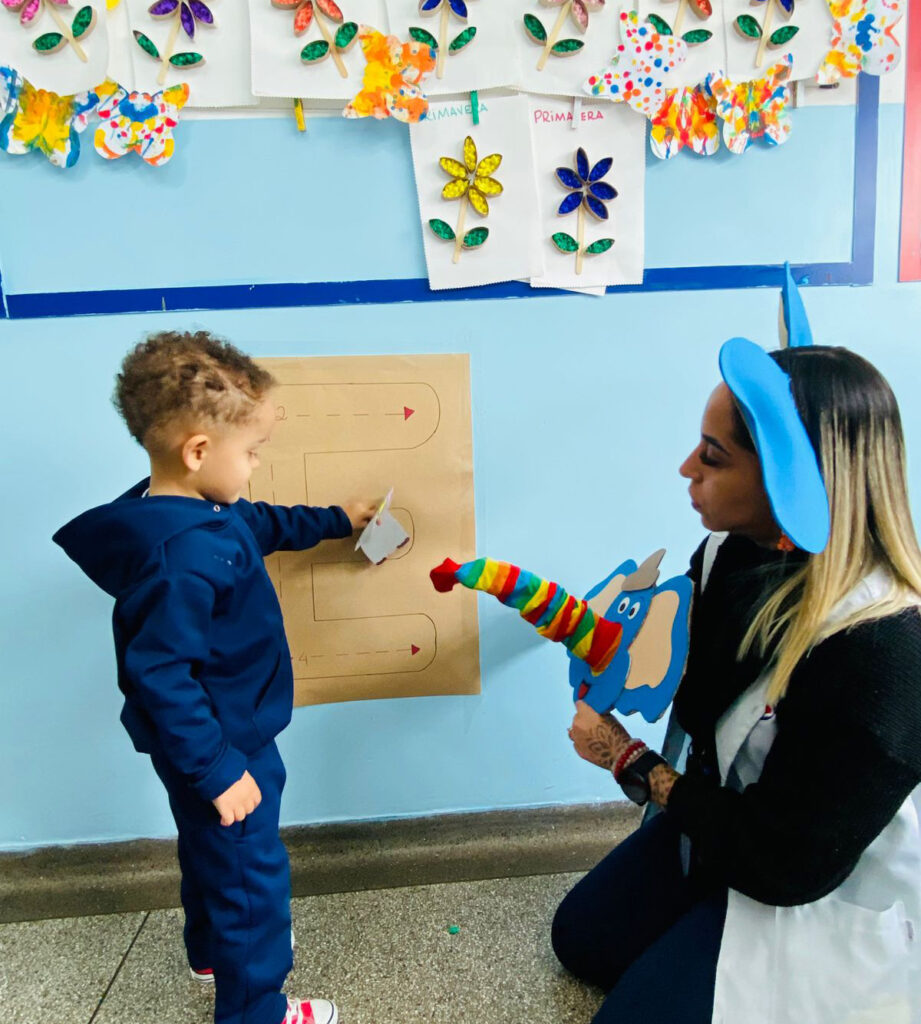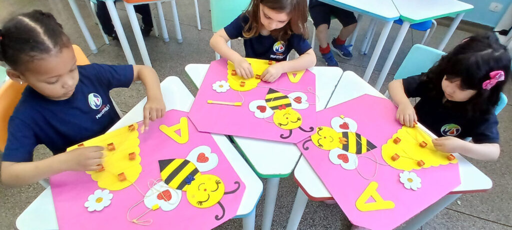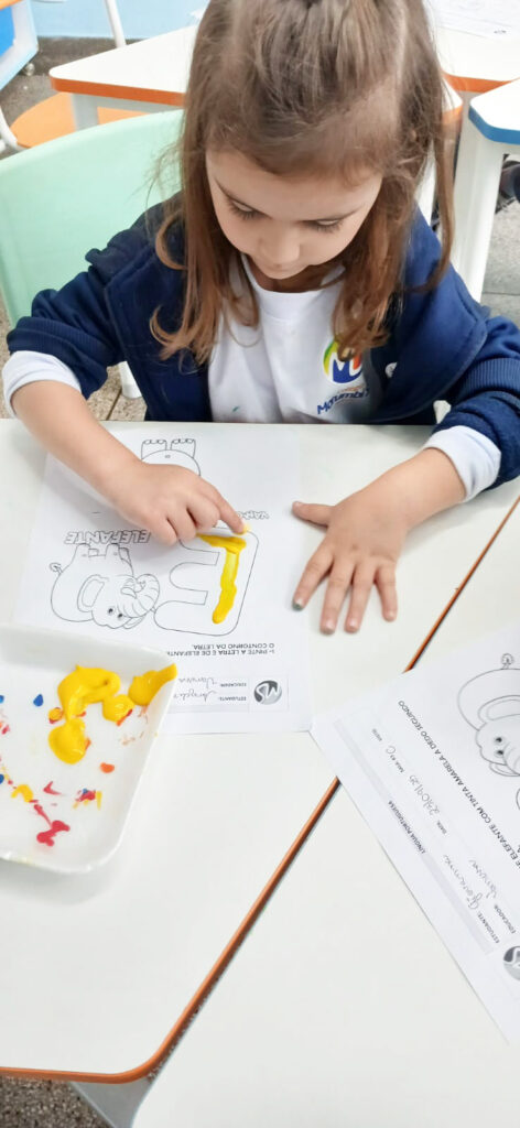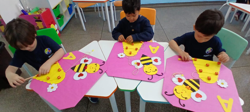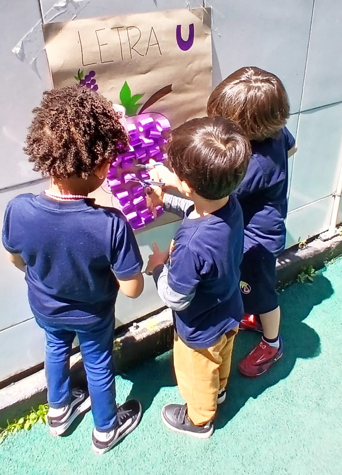 Com a “lavanderia das vogais”, usaram uma mãozinha para segurar a roupa e a outra para prendê-la no varal, aprendendo a sequência das vogais e o seu som. Nesta atividade, mais que aprender sobre as vogais, as crianças exercitaram a coordenação motora fina.