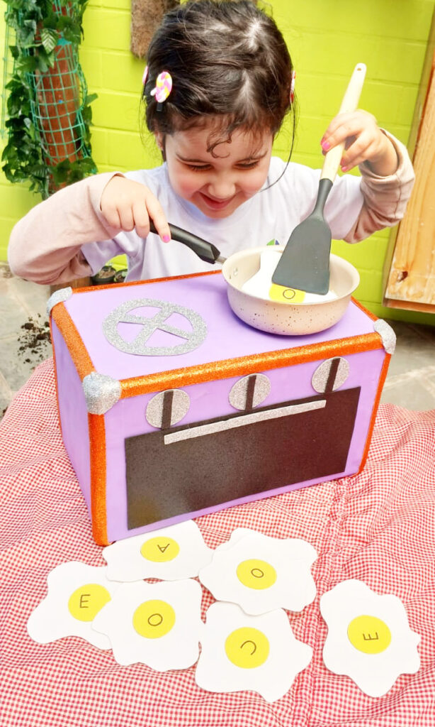 Na sequência trabalharam o “ovo na fritadeira”, com o objetivo de identificar as vogais com a letrinha O no meio de outras diferentes.