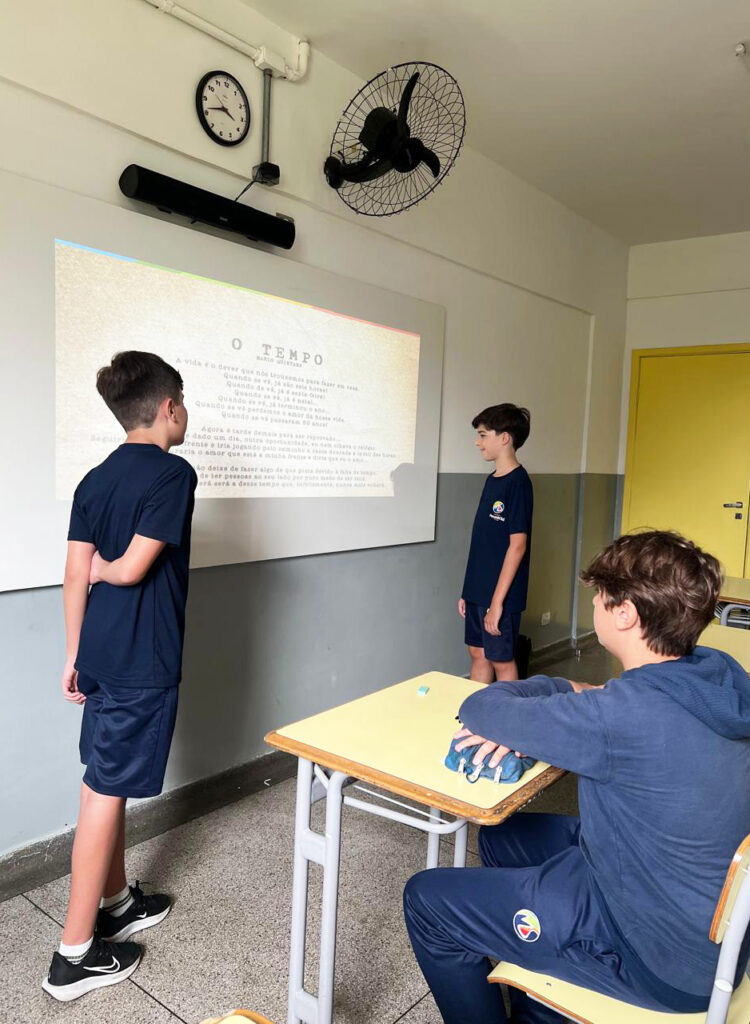 Para ampliar essa reflexão, realizaram a leitura do poema “Tempo”, de Mário Quintana, que deu origem a um bate-papo muito significativo com os alunos. A conversa abordou a passagem do tempo, as expectativas para o futuro e a importância de viver cada etapa com consciência e intenção.