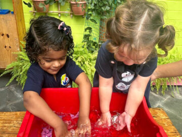 Educadora Faten ShaheenKindergarten 2 BM O uso do gelo na educação infantil é um recurso que auxilia muito no desenvolvimento sensorial e cognitivo por meio de experiências lúdicas. No Kindergarten 2, a professora Faten propôs