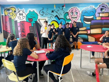 Educadora Eni Takeuchi / Português7º e 8º ano do EFAF Os estudantes dos 7ºs e 8ºs anos do EFAF participaram de um recital de poemas. O encontro marcou o percurso de aprendizagem realizado até aqui