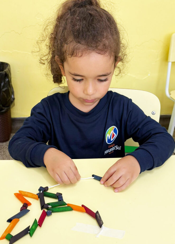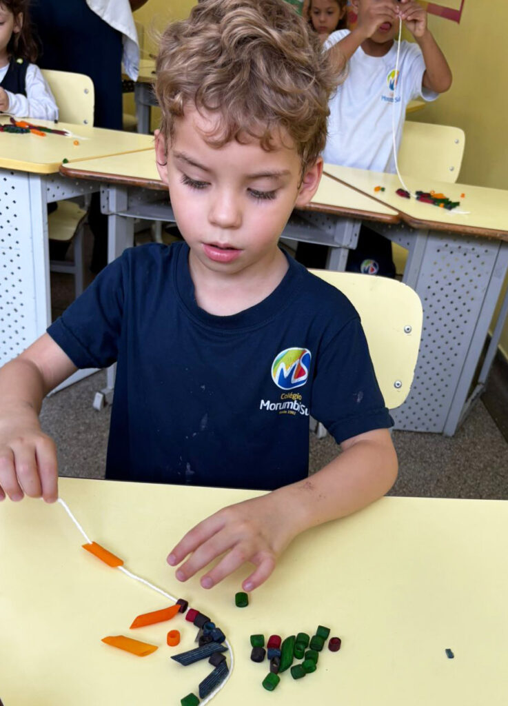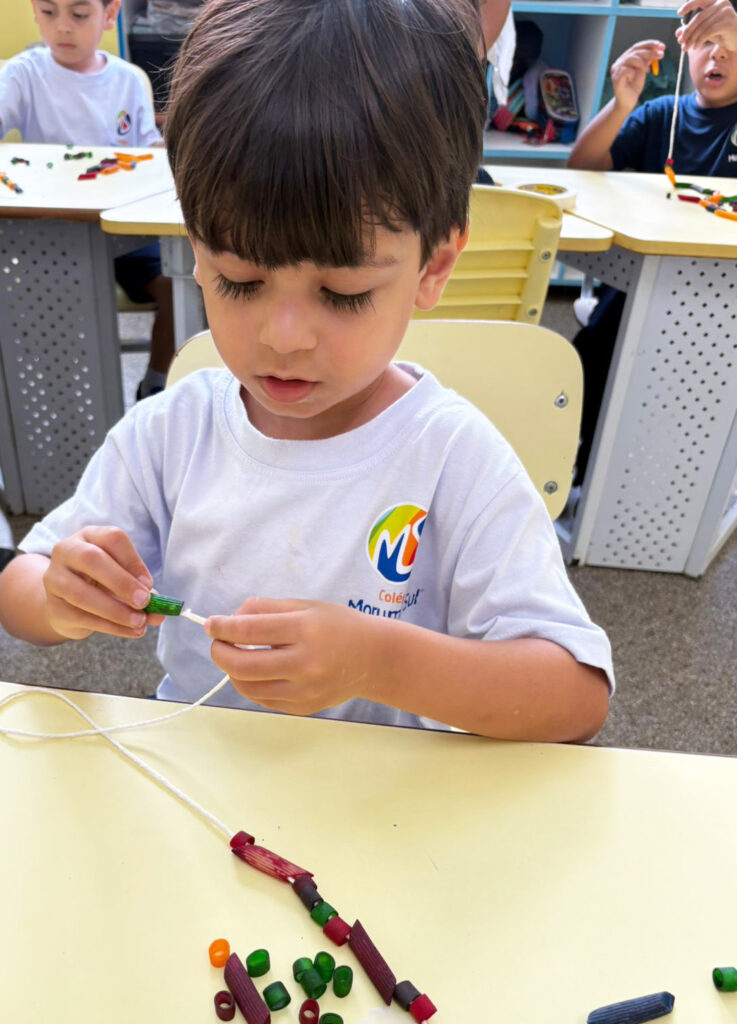 E, por fim, montaram colares de macarrão colorido, uma atividade que envolveu atenção, planejamento e persistência.