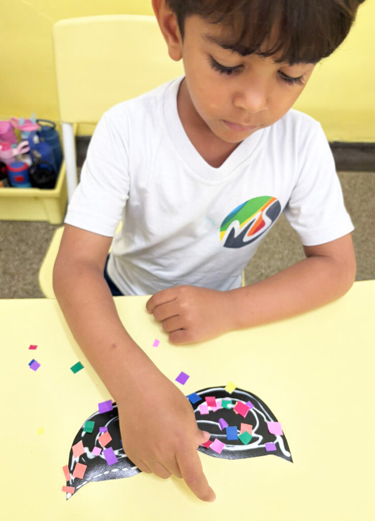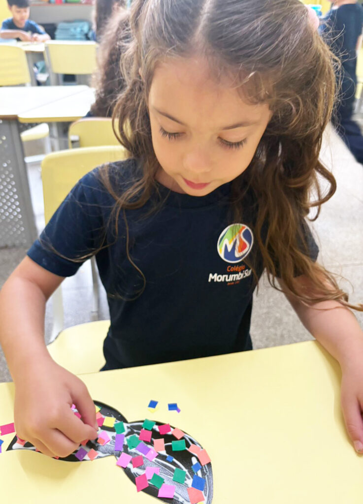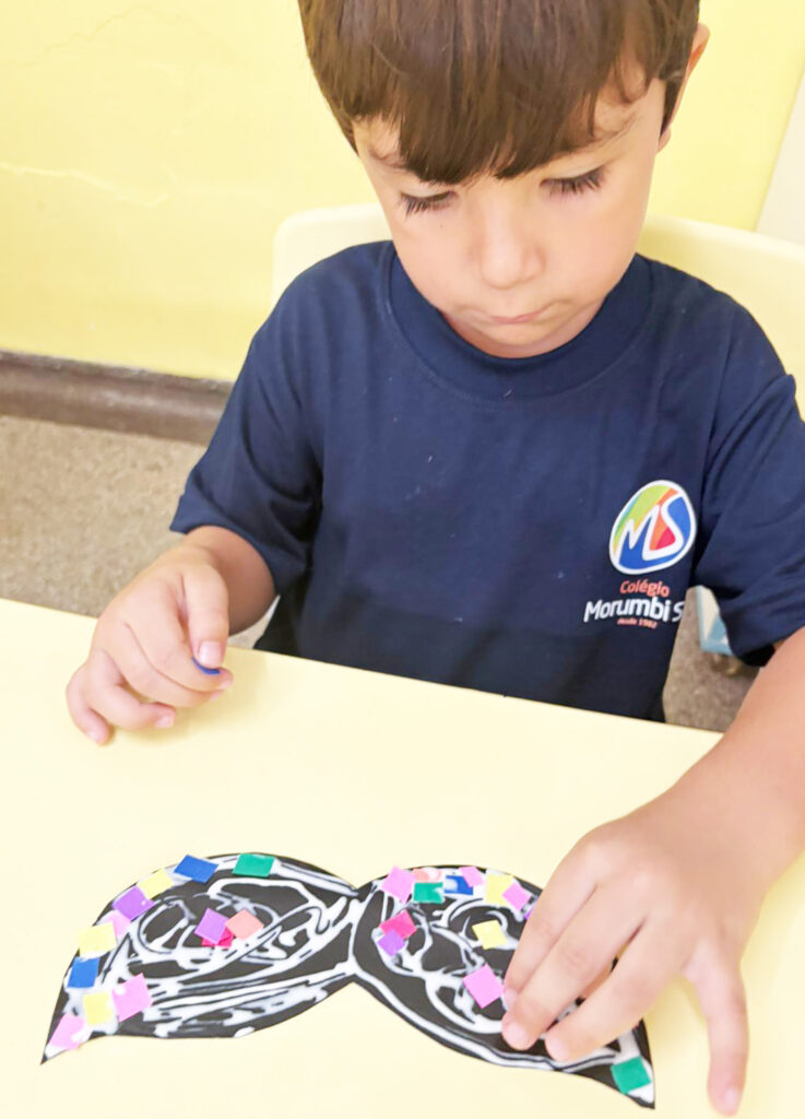 Ao longo dos dias, confeccionando seus acessórios de carnaval, os estudantes participaram de diferentes propostas que estimularam habilidades importantes. Na confecção das máscaras, trabalharam o movimento de pinça ao manusear pequenos papéis para colagem, fortalecendo a coordenação motora fina.