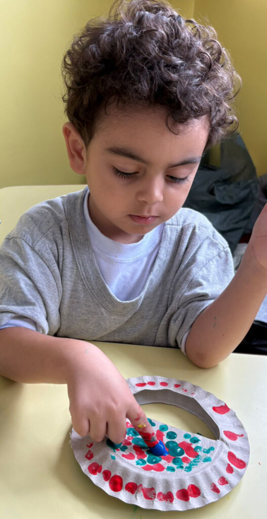Também construíram um pandeiro com pratos de papelão e feijão. Durante a pintura com pontinhos coloridos, exercitaram o controle do tônus e a organização do espaço, sendo incentivadas a explorar toda a superfície.