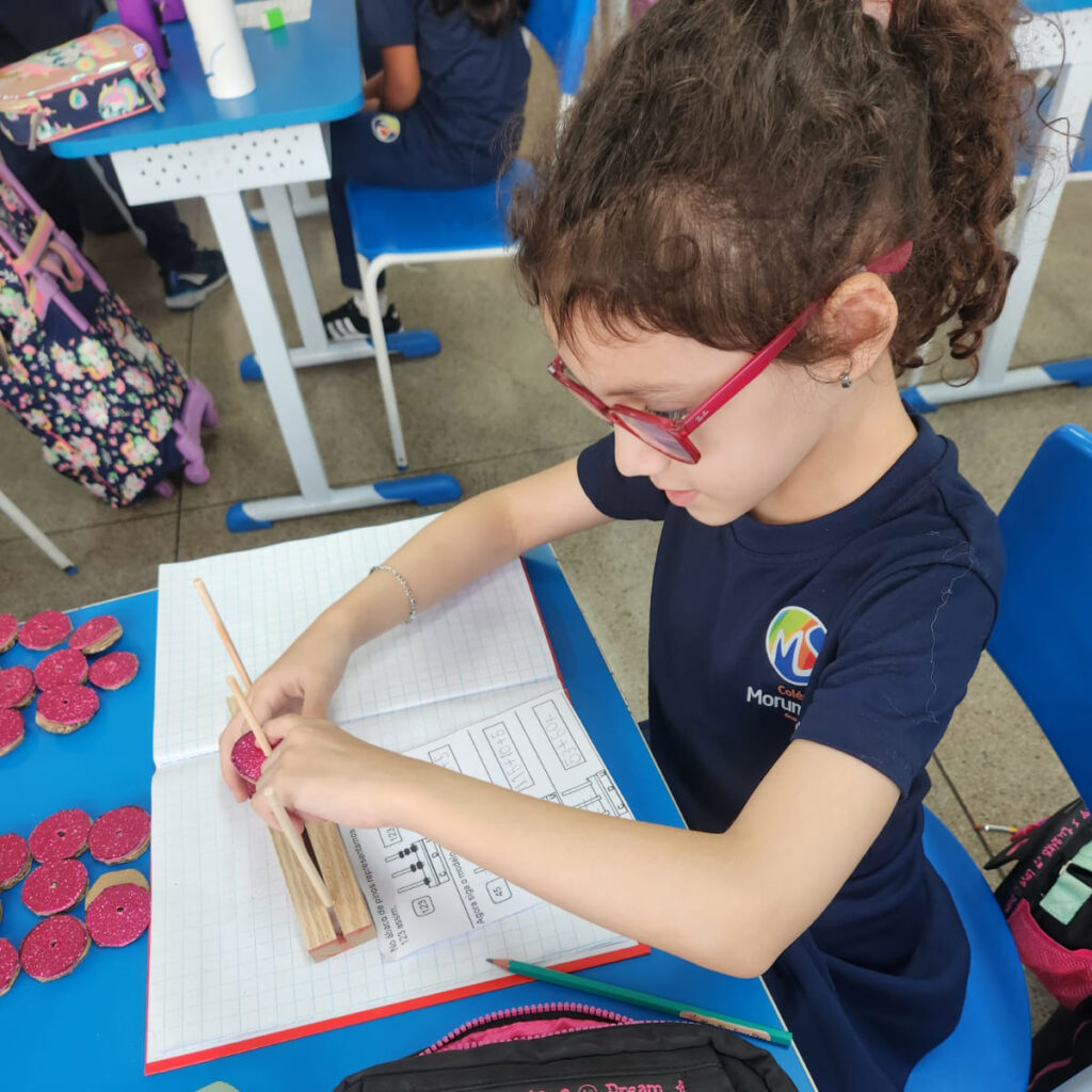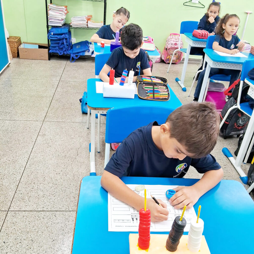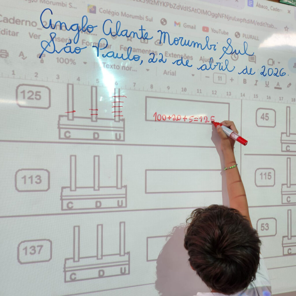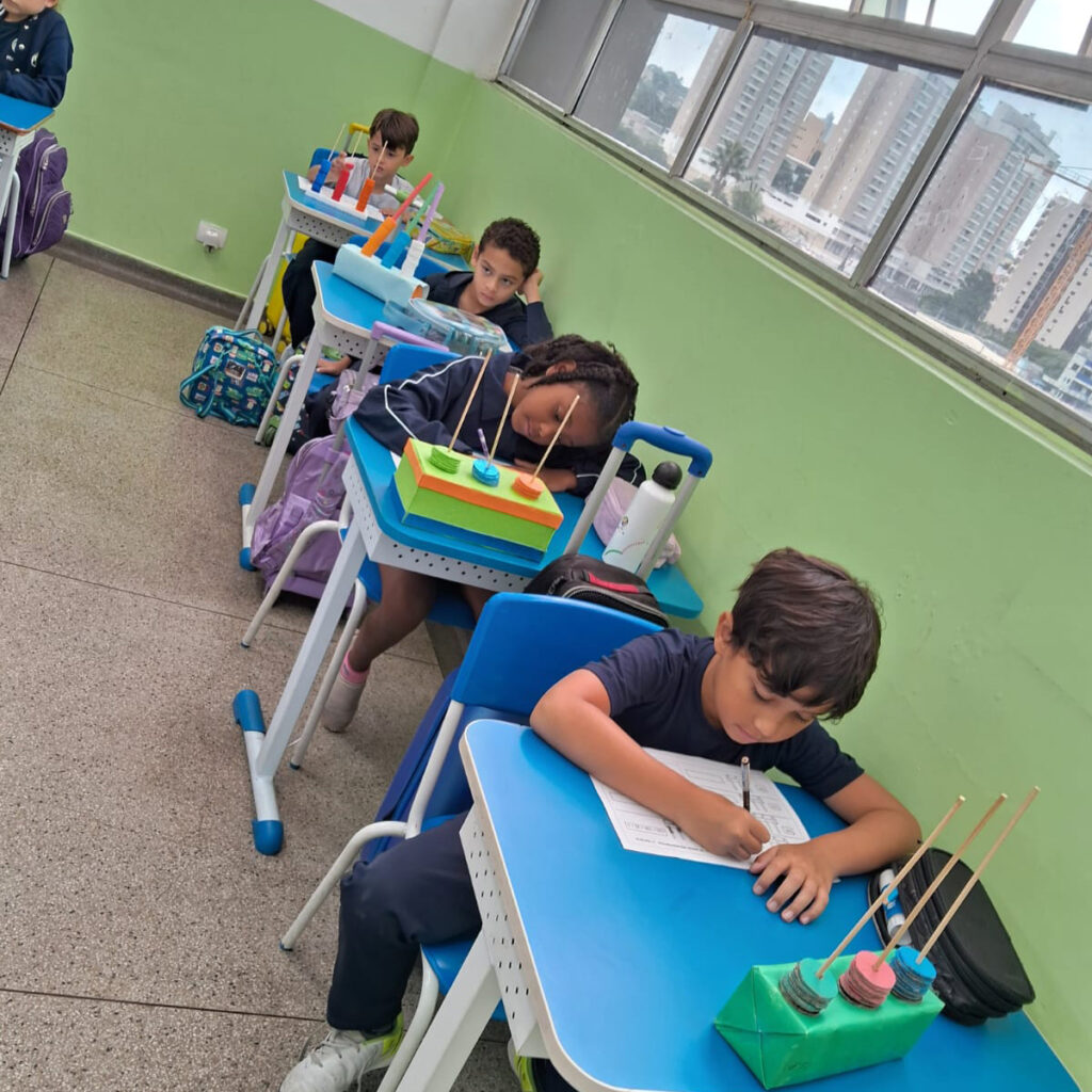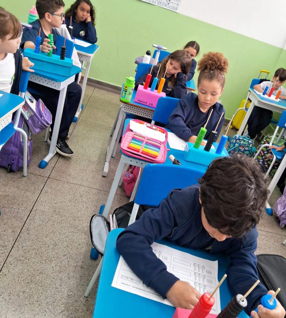 Os estudantes dos 2ºs anos estão avançando no estudo da matemática. Com o ábaco, um instrumento usado para realizar operações aritméticas, como adição, subtração, multiplicação e divisão, eles vão conhecendo o valor posicional dos números, de forma concreta e muito divertida.