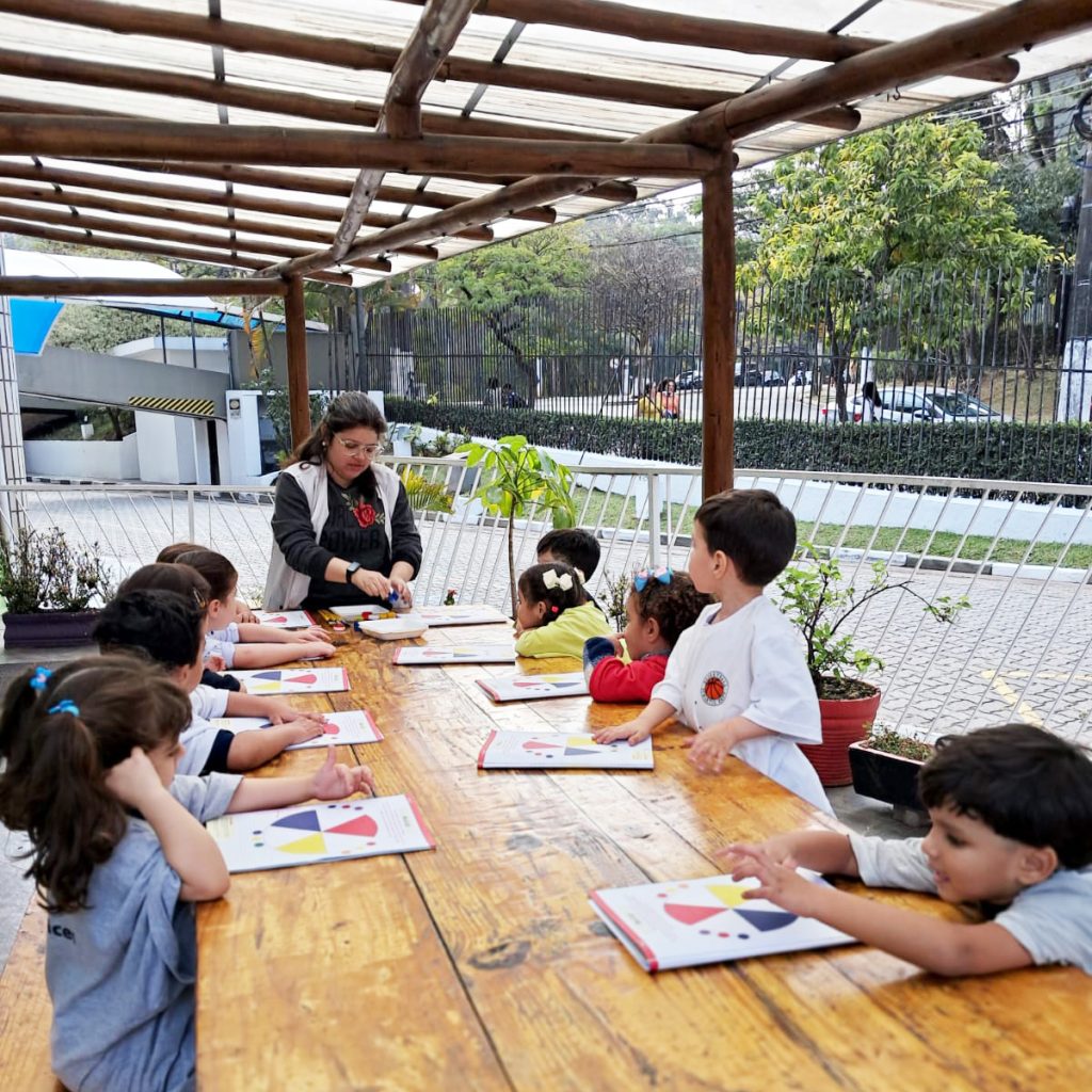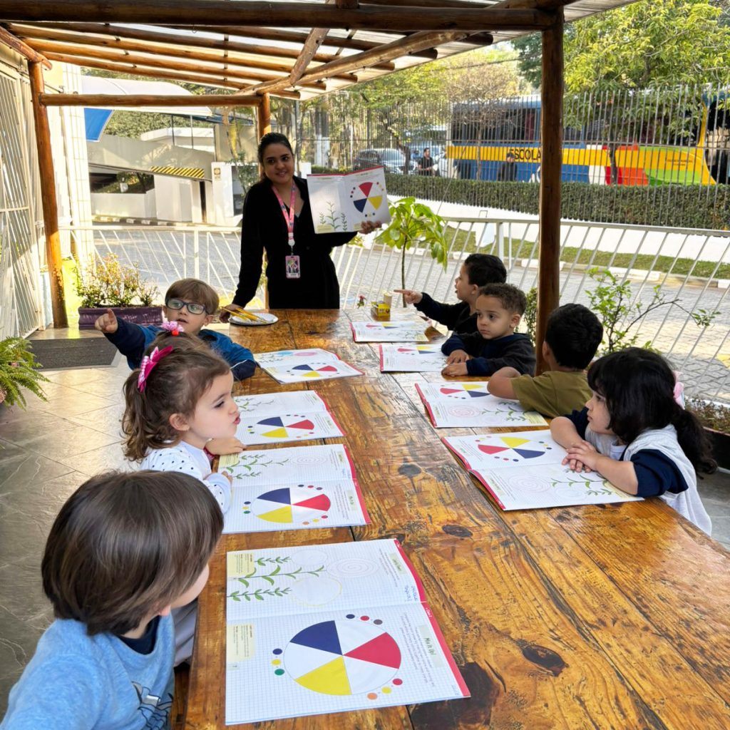 Além de se divertirem com as cores, os pequenos também praticaram frases simples, trabalhando o currículo bilíngue.