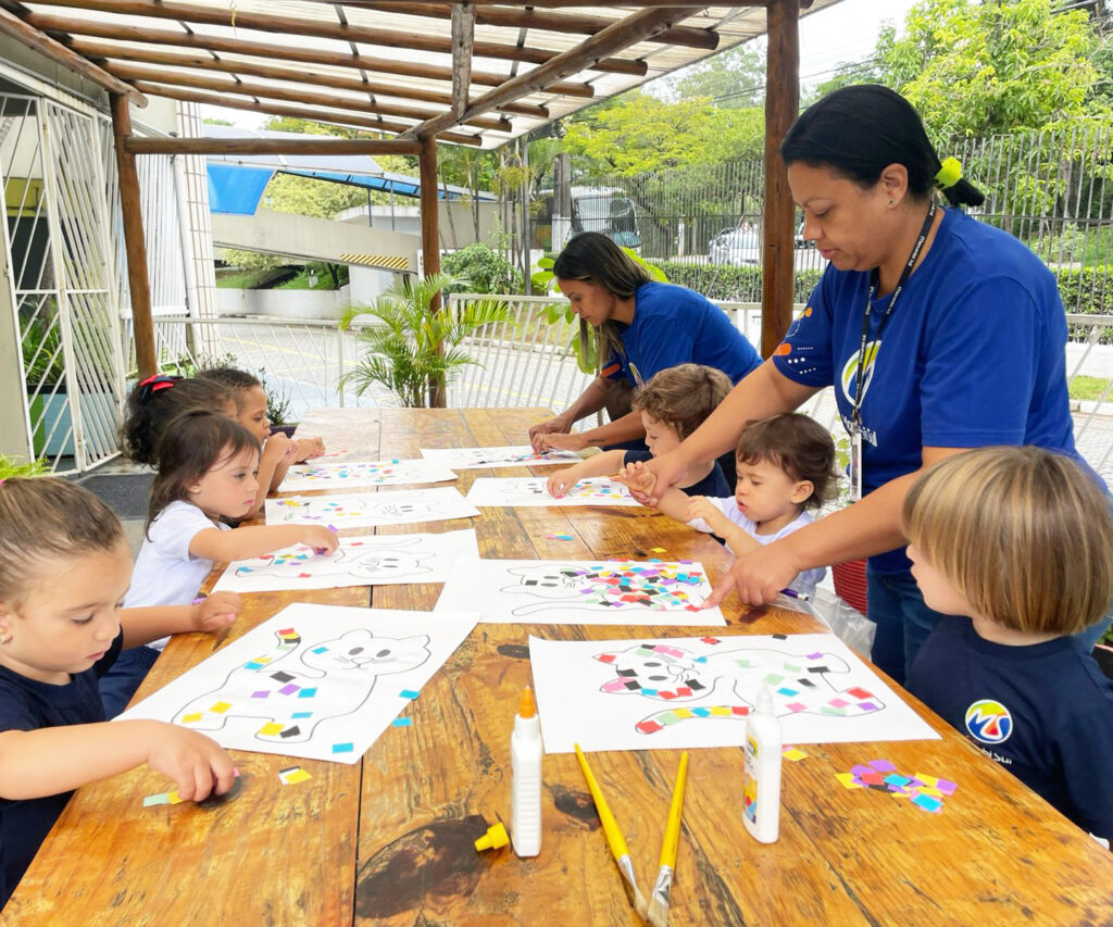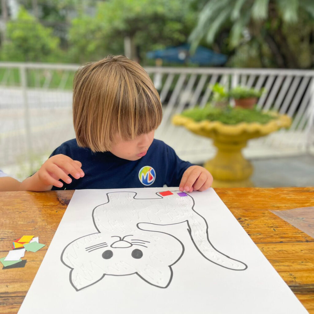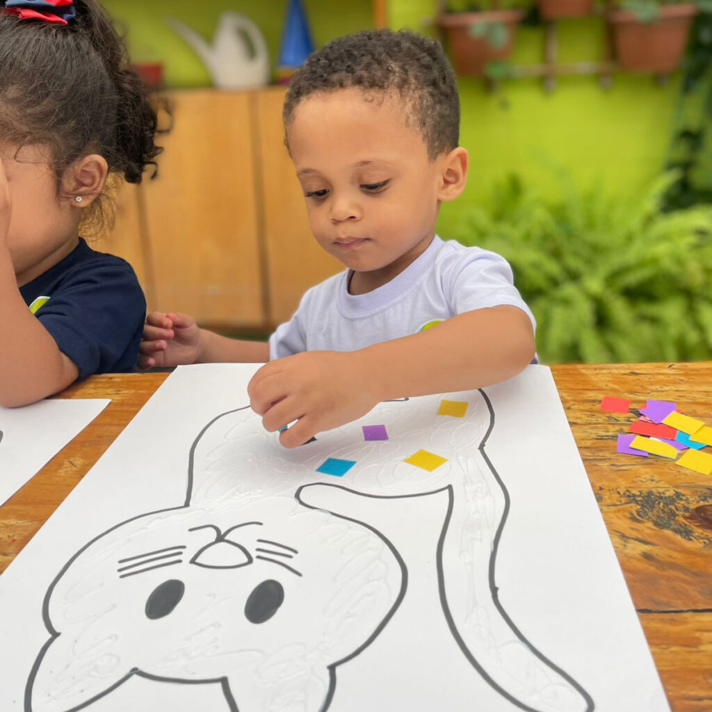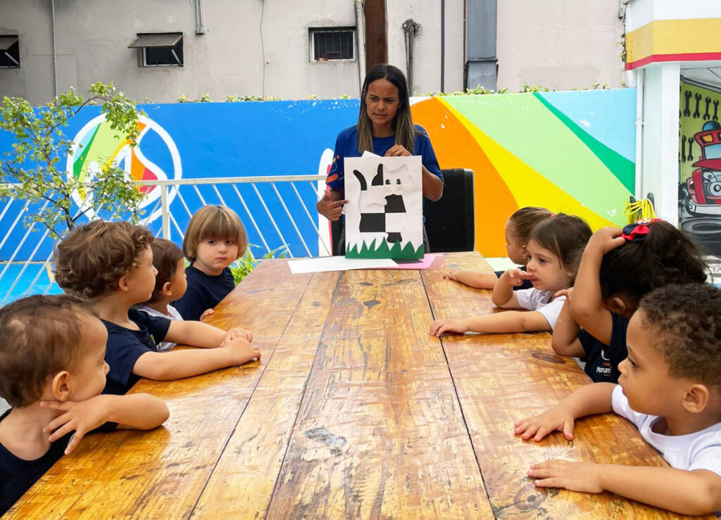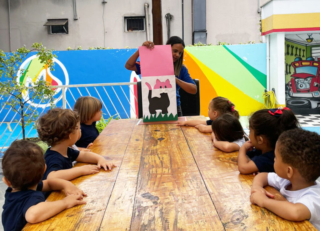 Com ajuda da professora, a turma do K2A trabalhou a história “O Gato Xadrez”, inspirada no livro infantil de Bia Vilela que narra, por meio de rimas e cores, as aventuras de um gato que muda de cor após cair da janela. A história lúdica introduz conceitos como cores, sequência e rimas, assim estimulando a imaginação e a criatividade