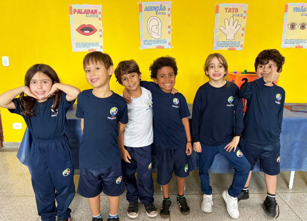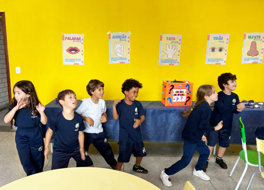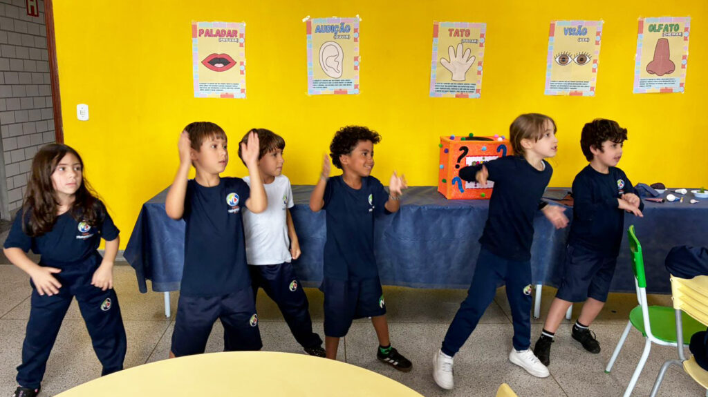 Os alunos dos 1º anos B e C tiveram uma aula muito especial sobre os cinco sentidos. Com os recursos apresentados, eles usaram o corpo para perceber o mundo ao seu redor: “com os olhos vemos, com os ouvidos escutamos, com o nariz sentimos cheiros, com a língua percebemos os sabores e com a pele sentimos o toque”!