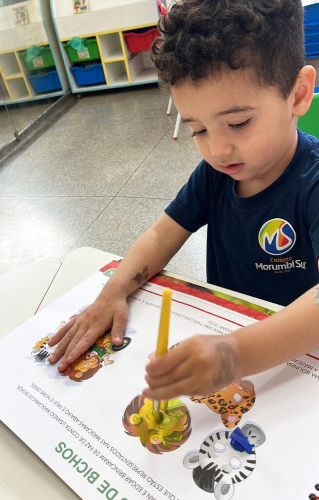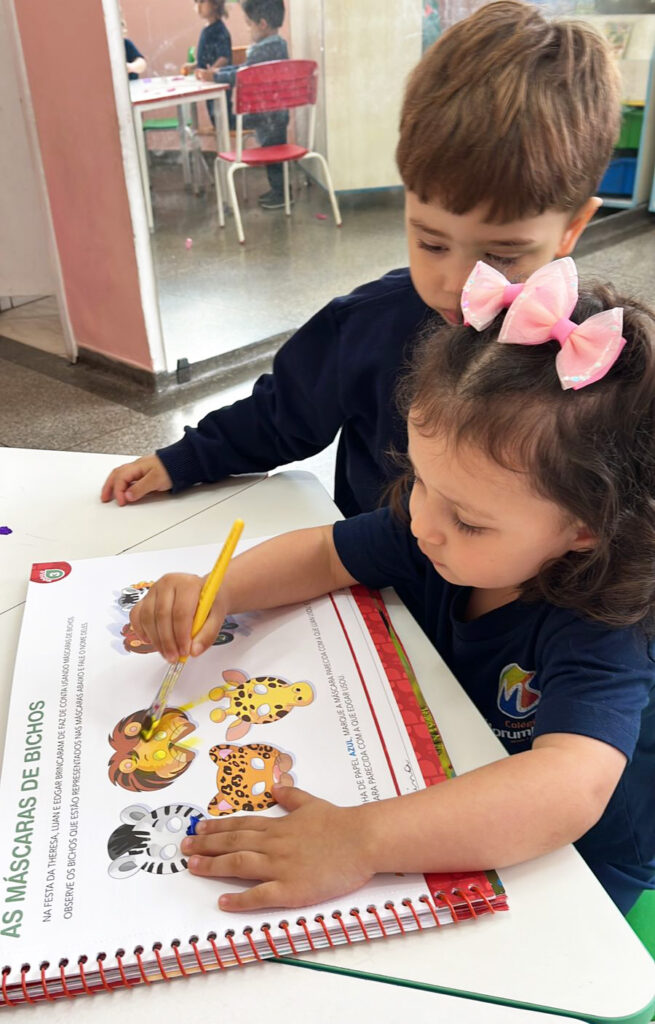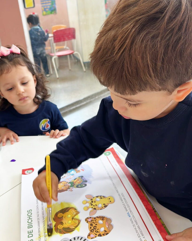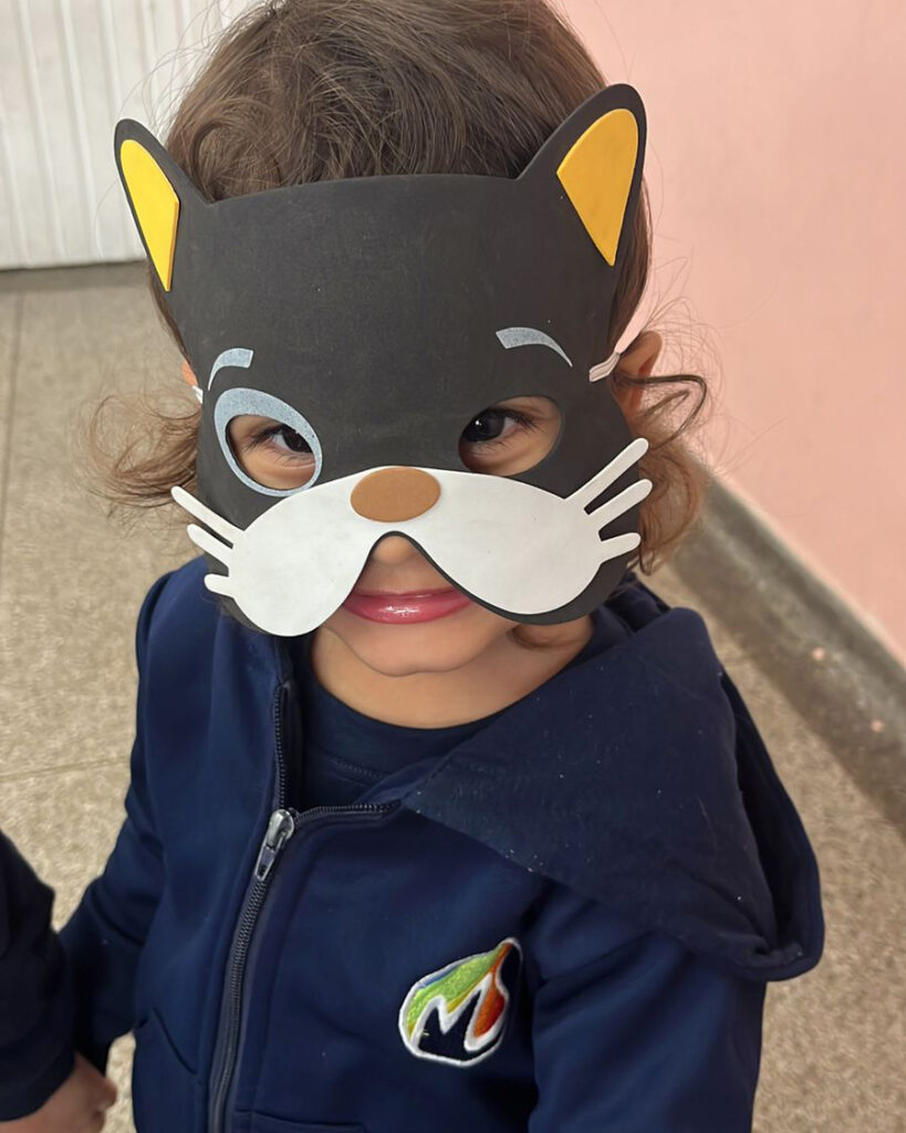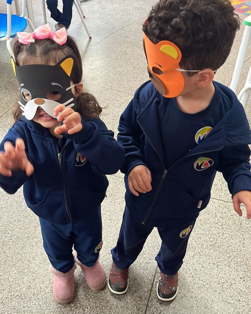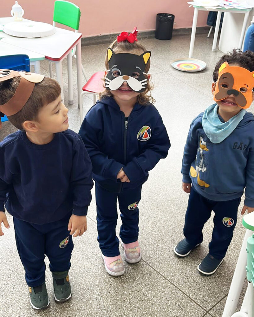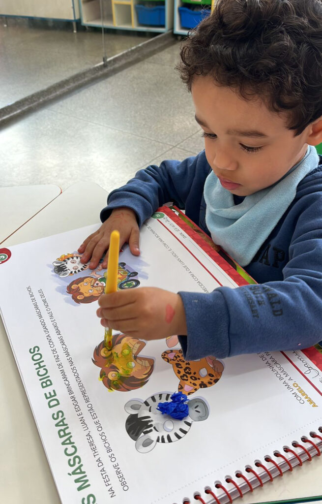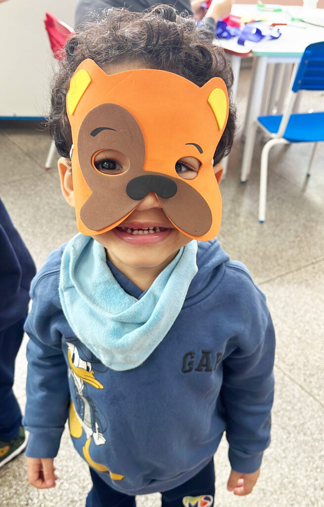 A partir da proposta do livro Anglo sobre os animais da África, os alunos do Kindergarten 2 vivenciaram uma gostosa brincadeira de imitação, utilizando máscaras com as “carinhas” dos bichos.