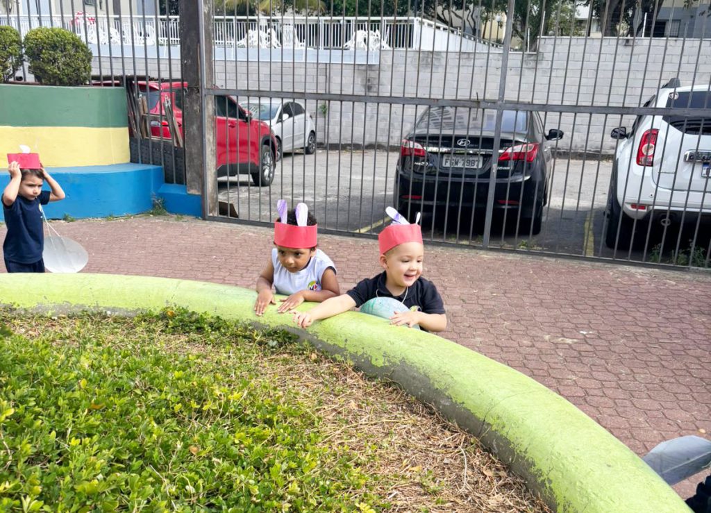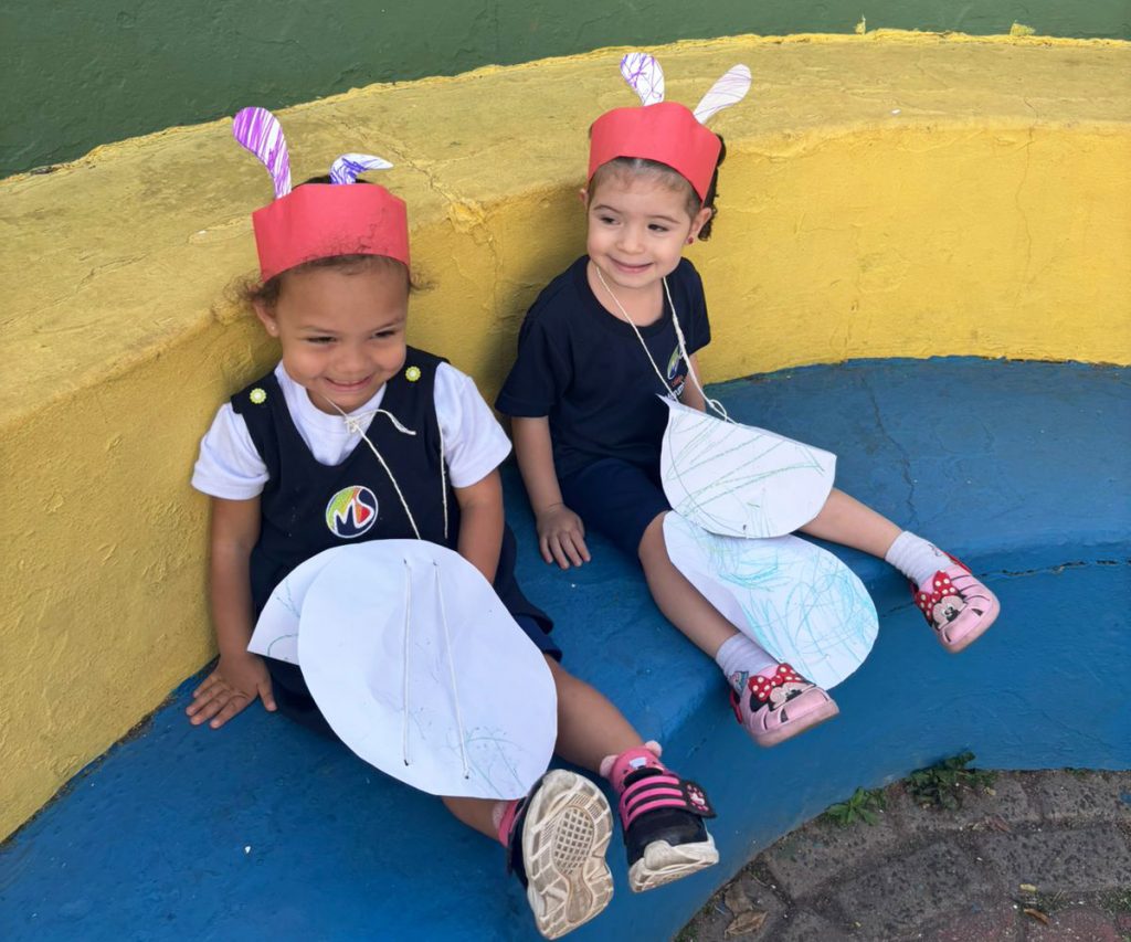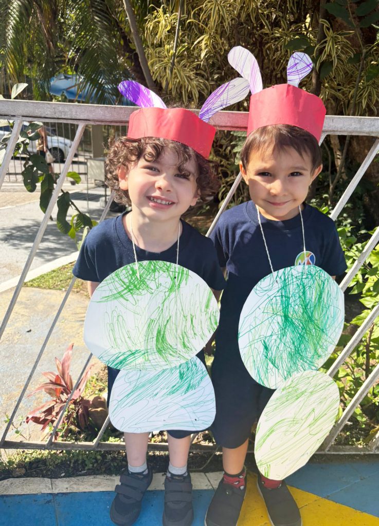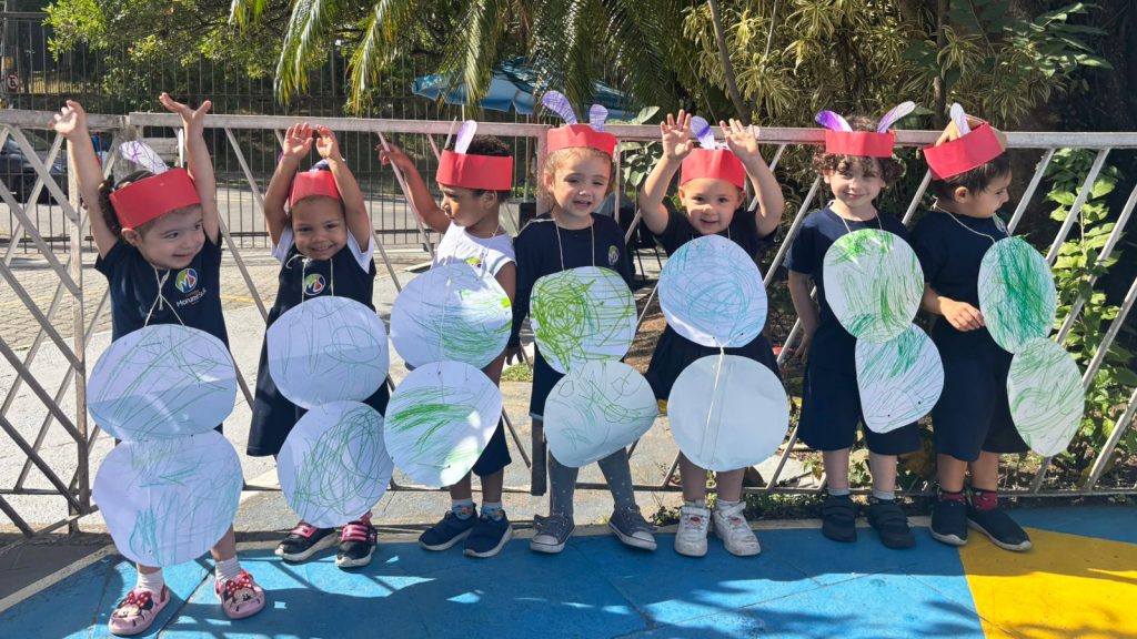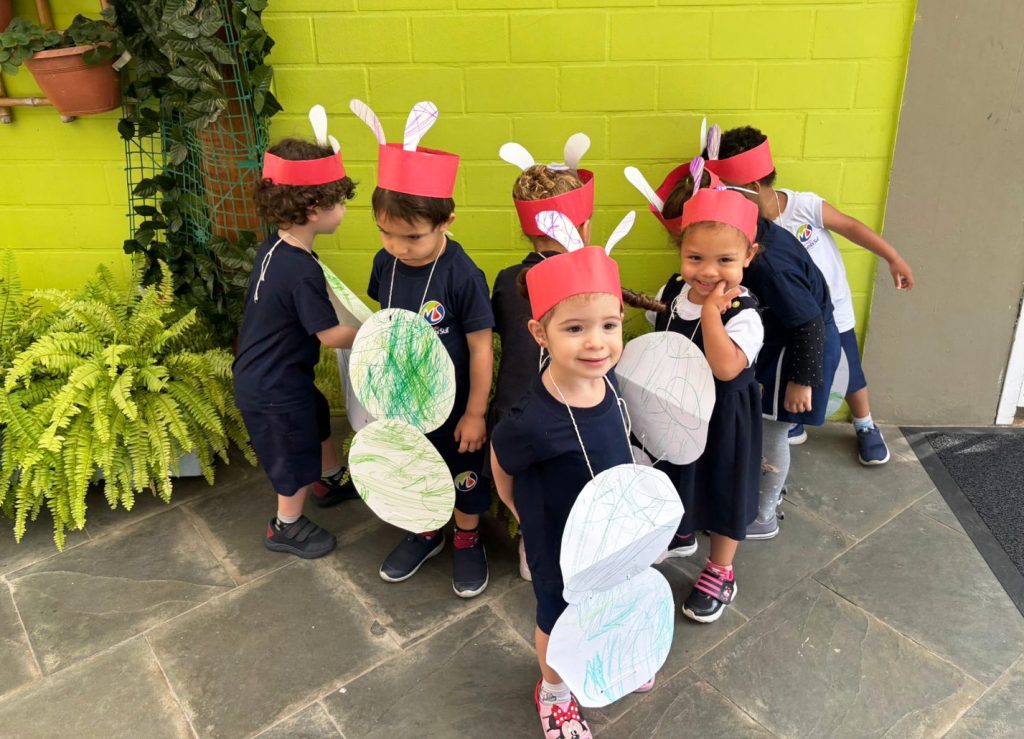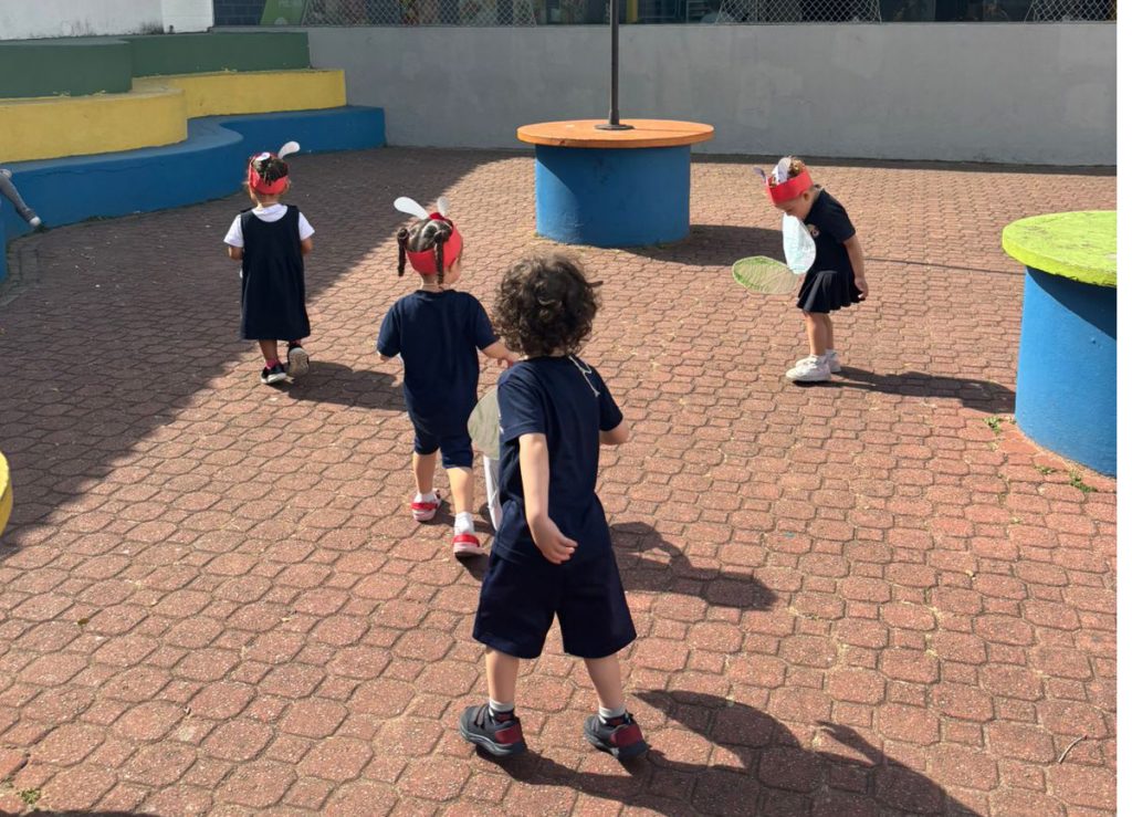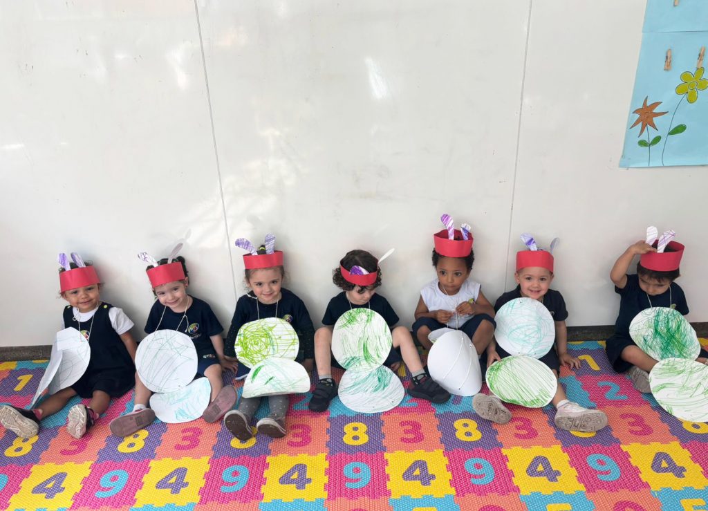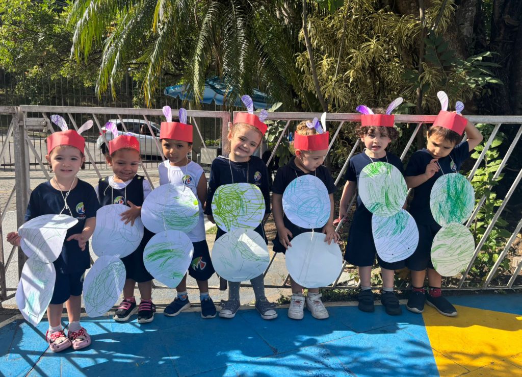 Cada um ajudou a colorir a própria fantasia da lagarta, explorando cores, formas e a criatividade. Depois, todos se vestiram como a personagem e, juntos com a teacher Letícia, foram conhecer diferentes espaços da escola, vivendo a experiência de “uma lagarta que sai explorando o mundo ao seu redor”.