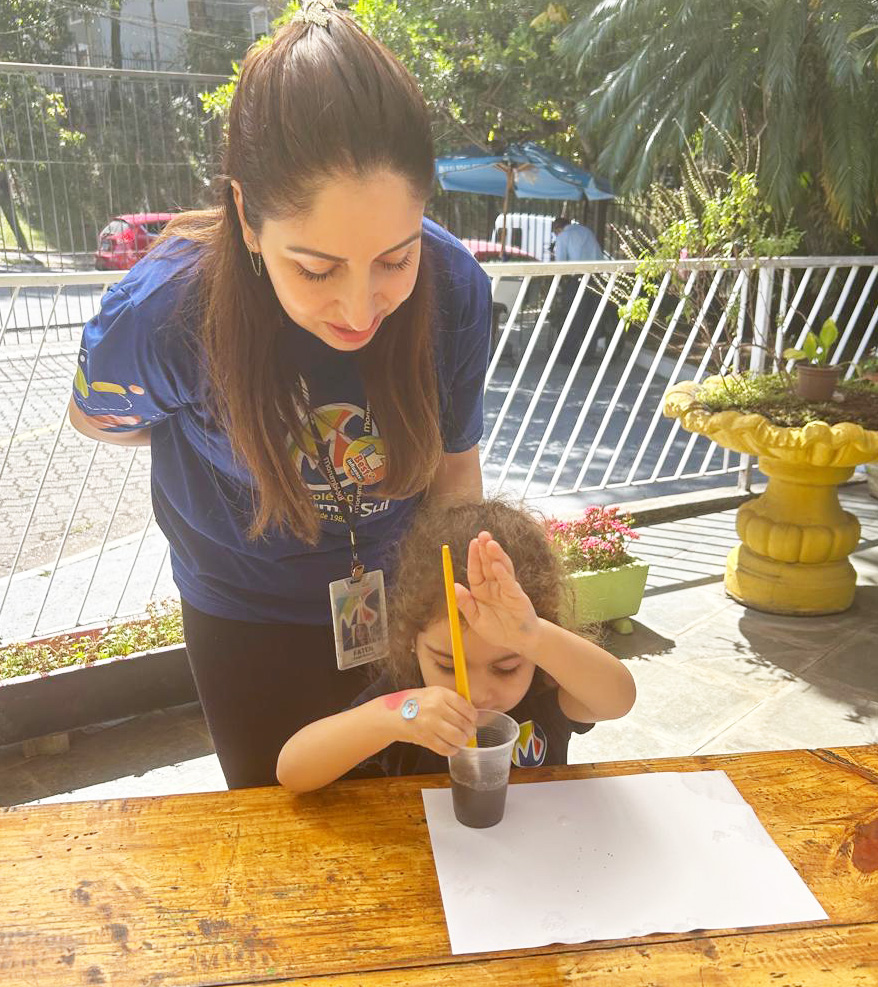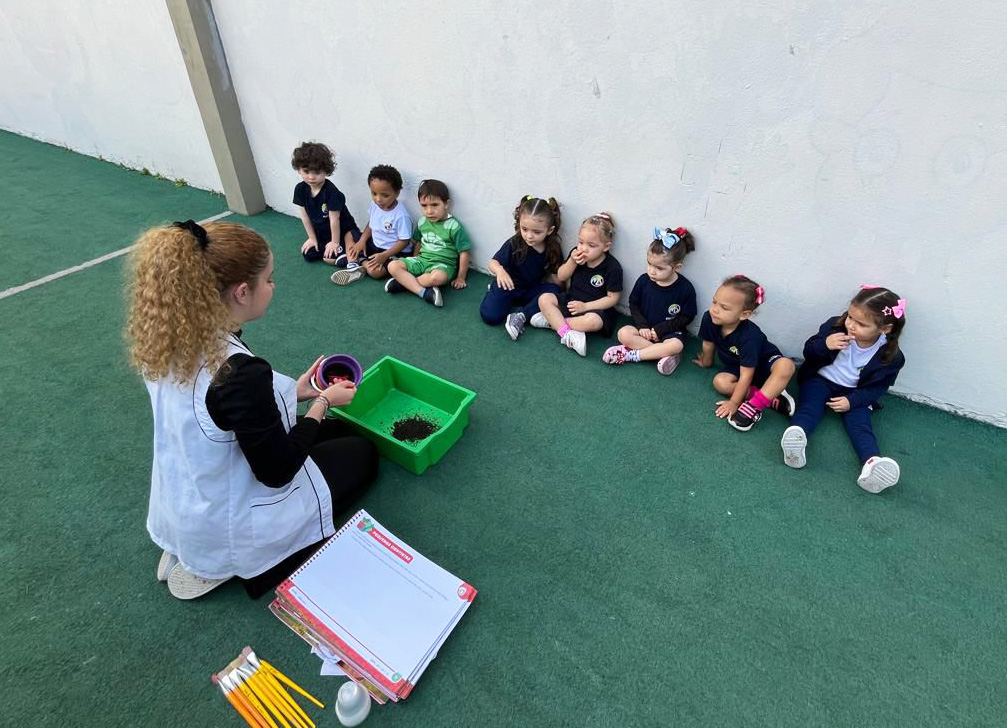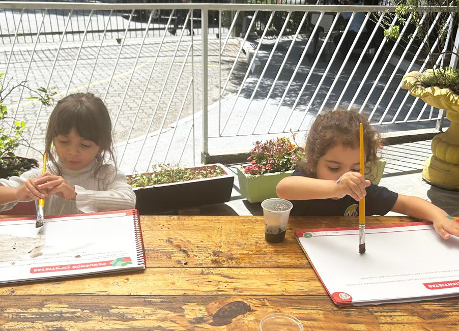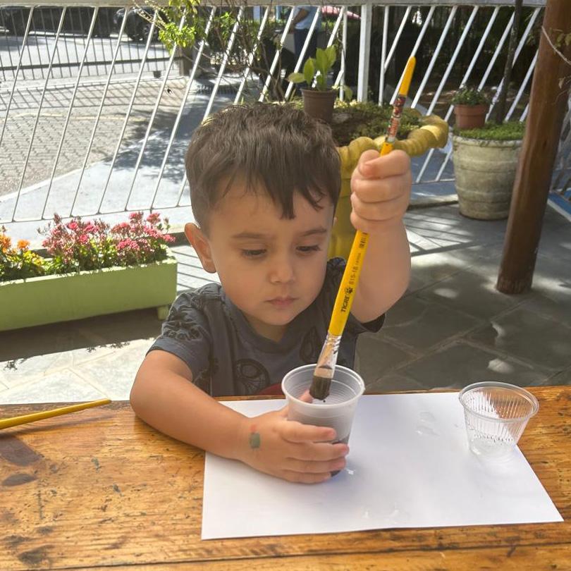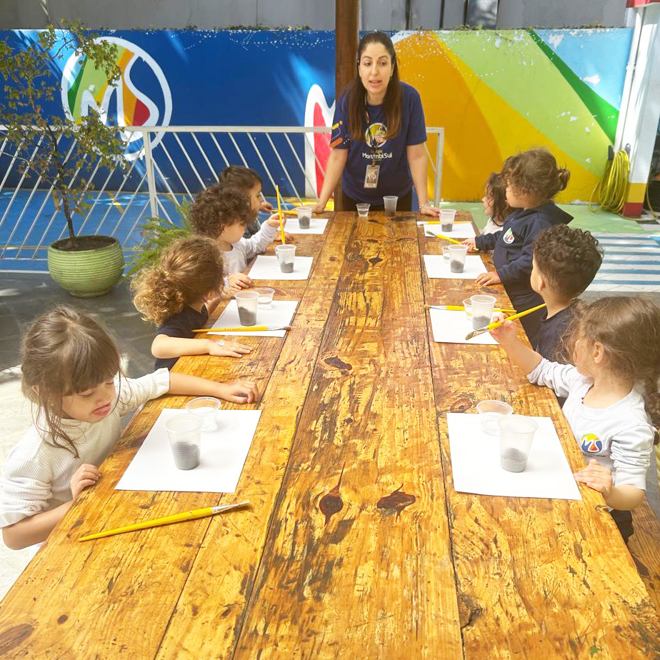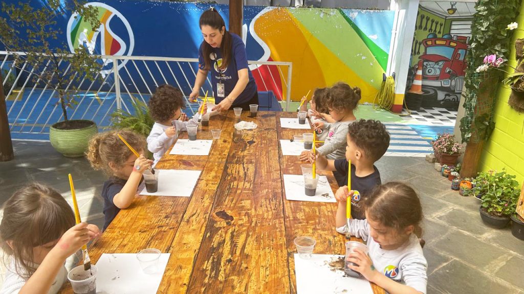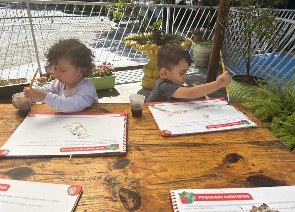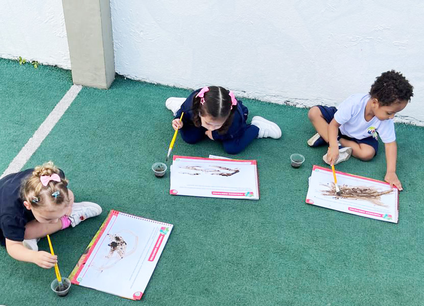 “Esse amigo adora água e se refresca tomando banho de lama. Então, que tal criar a nossa própria tinta de lama?”, foi a proposta das professoras. Todos saíram da sala e foram para a minicidade, onde pintaram e se divertiram com muita criatividade.