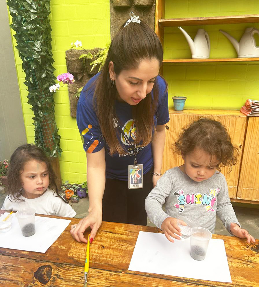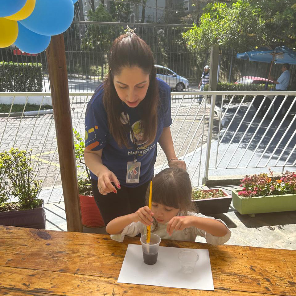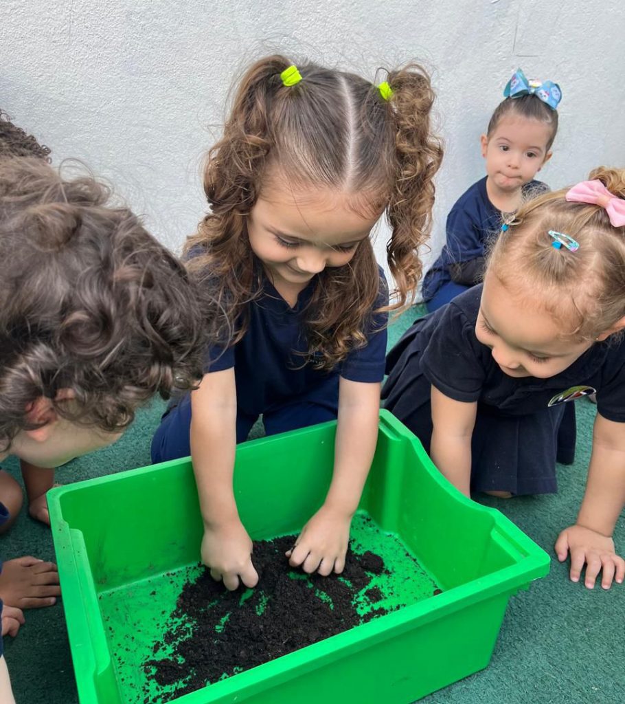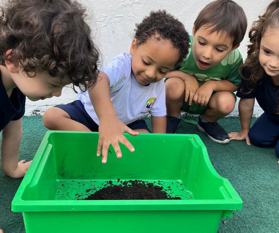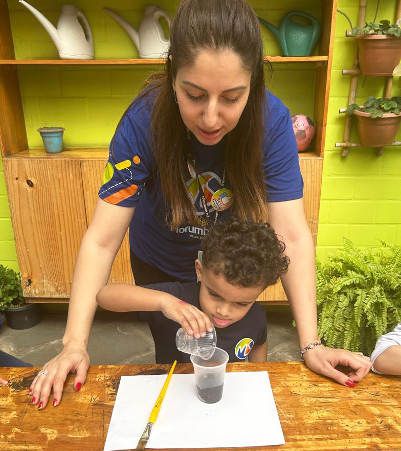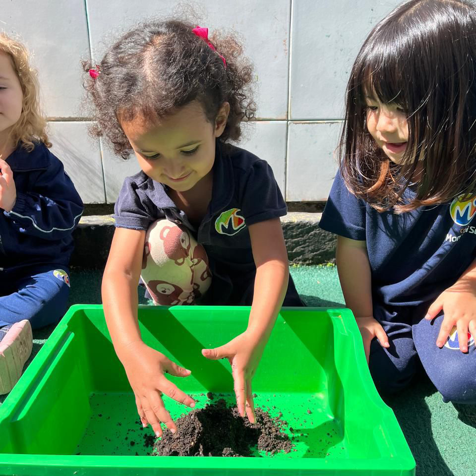 “Esse amigo adora água e se refresca tomando banho de lama. Então, que tal criar a nossa própria tinta de lama?”, foi a proposta das professoras. Todos saíram da sala e foram para a minicidade, onde pintaram e se divertiram com muita criatividade.